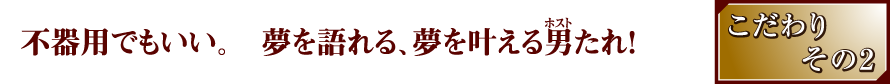 この度は、私たちと一緒に夢をかなえていただける仲間、そして、私のこだわりに共感して頂ける「素人でもヤル気のある、頑張るホスト」さんを募集したいと思います!