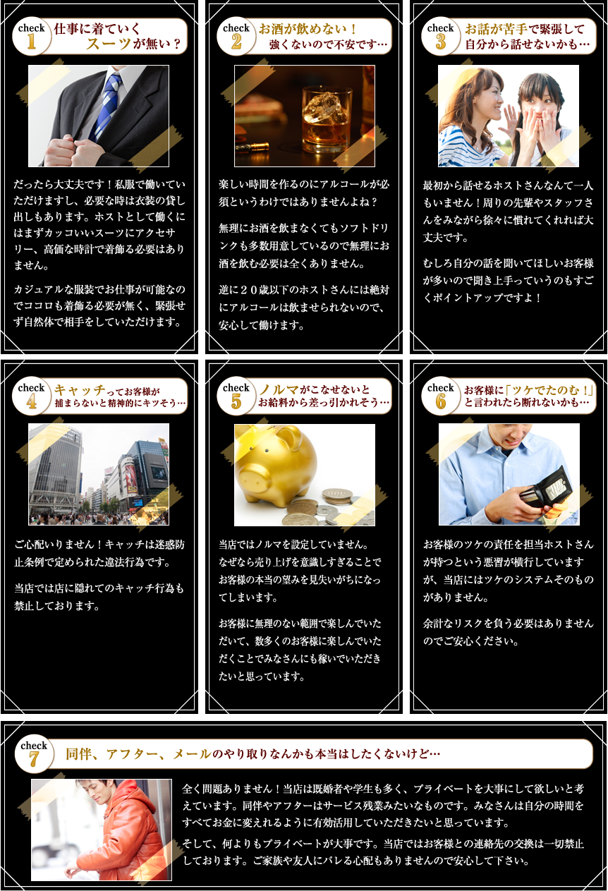 当店では上辺だけでなく、中身も兼ね備えた素敵なホストさんに働いていただきたいと思っています。 ホストとは長髪でスーツを着て着飾るだけのお仕事ではありません。 当店では普段着のみなさんのありのままの魅力をお客様に楽しんでいただきたいと思っています。 よって、今までホストのイメージとは結びつかなかった、短髪男子・体育会系男子・草食系男子・インドア男子はもちろんカッコイイ系・カワイイ系の雰囲気の男子含め、いろんなタイプの男性を募集しております。 当然勤務中にスーツを着る必要はありません。学生のホストさんはみんなジーンズにTシャツ、社会人のホストさんは会社帰りのスーツ姿のまま勤務してくれています。何も気取る必要はありません、あなたのあなたらしさを磨いてお客様に楽しい時間を提供してあげてください。